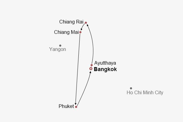 - Domestic airfares (economy class seat): Bangkok - Chiang Rai, Chiang Mai - Phuket - Bangkok