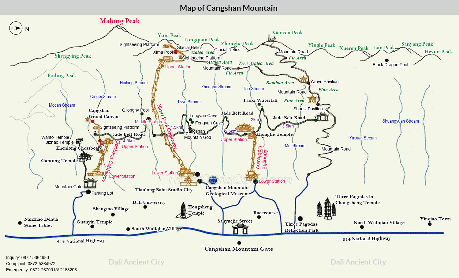 Ancient buildings, city walls and the old city moat are the sites most frequented by visitors. Cangshan Mountain and Erhai Lake are praised as the city's leading scenic areas. Most attractions lie between these two landmarks, such as the Butterfly Spring, and the Three Pagodas of Chongsheng Temple.