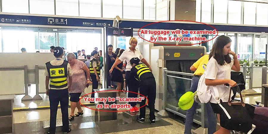 Your ID certificate like a passport used for ticket booking will be checked at the entrance and overseas passengers should use the manual check channel. You will also need to go through a security check before going inside just like what you need to do when taking a flight but not as strictly. As long as you do not carry prohibited items, it is generally easy to pass through (see baggage allowance).