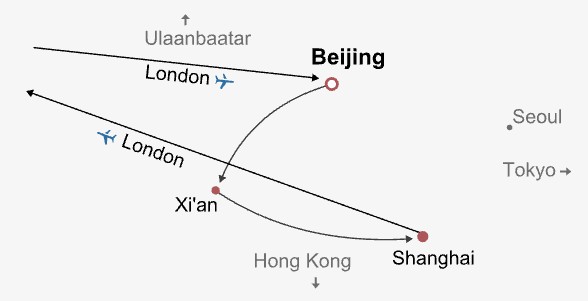 Most China tours from UK with airfare included depart from London, because there are direct flights reaching over 10 cities in China, including the most favored travel destinations like Beijing, Shanghai, Guangzhou, and Xi’an. Besides, travelers can fly from Manchester or Edinburgh to Beijing. A one-way trip takes around 10 hours.