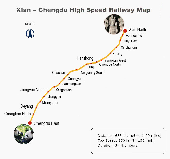Around 80 pairs of high speed trains are running along Xi'an - Chengdu High Speed Railway, whose distance is 658 kilometers (409 miles). The travel time is 3 - 4.5 hours, which makes a day trip between Xi'an and Chengdu possible. A second class ticket costs CNY 224 - 300.
